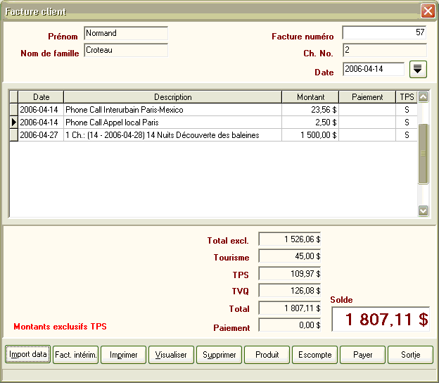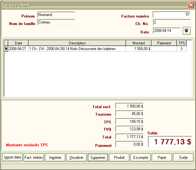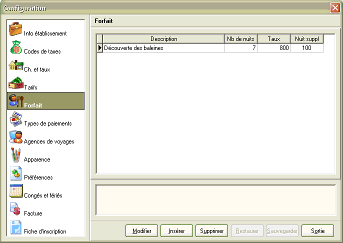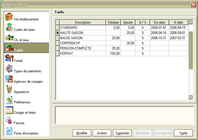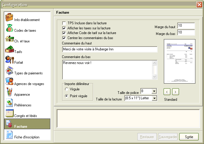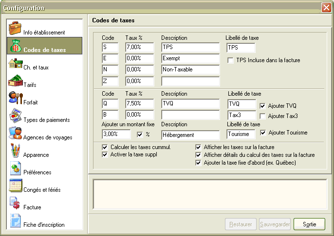 La nouvelle version contient des changements majeurs à la base de données et touche plusieurs menus et options du logiciel, notamment la configuration des taxes. Avant d'effectuer la réinstallation du produit, prenez soin de faire une copie de sauvegarde de votre base de données et notez les valeurs inscrites dans les onglets de configuration car ceux-ci risquent d'être réinitialisés lors de l'installation. Pour vous simplifier cette tâche, nous avons préparé un formulaire en blanc que vous pourrez imprimer et sur lequel noter les paramètres propres à votre établissement.
