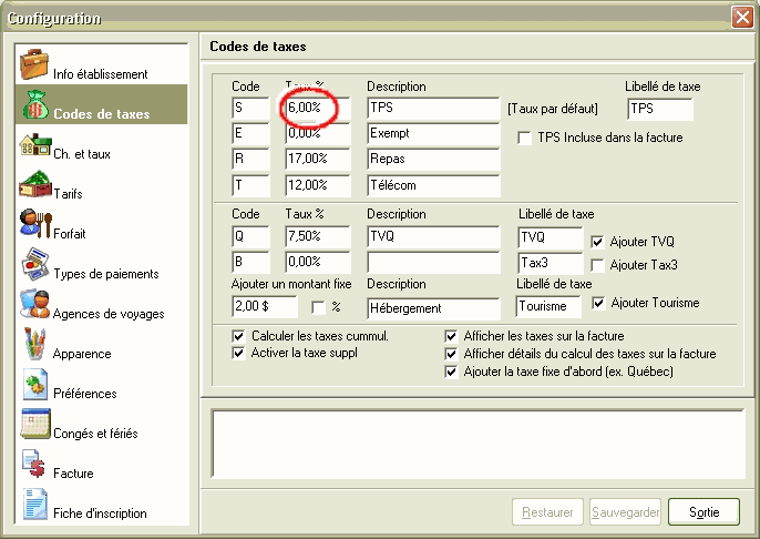 La nouvelle version contient des changements majeurs à la base de données et touche plusieurs menus et options du logiciel, notamment la configuration des taxes. Avant d'effectuer la réinstallation du produit, prenez soin de faire une copie de sauvegarde de votre base de données et notez les valeurs inscrites dans les onglets de configuration car ceux-ci risquent d'être réinitialisés lors de l'installation. Pour vous simplifier cette tâche, nous avons préparé un formulaire en blanc que vous pourrez imprimer et sur lequel noter les paramètres propres à votre établissement.
